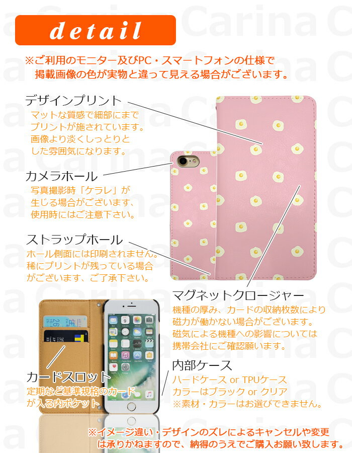 ケース詳細ケースタイプ:手帳型(ベルトなし)手帳生地素材:合皮レザー(ポリウレタン)内部ケース素材:ハードケース(ポリカボネート)手帳機能・特徴:カードホルダー、ストラップホール、カメラホール、マグネットクロージャー付属品:ロングチェーンショルダーストラップ※ブラック、ホワイト、ピンクの内1つ手帳詳細ドット調(水玉調)デザインのスマートホンケースカリーナ オリジナルのデザインを印刷したスマフォケース手帳カバーはドット調のシンプルな目玉焼きをプリントスマートホンの保護ができ、可愛いデザインが女性に人気スマフォに合わせた設計で携帯にも便利なオススメ商品ですカラー:A、B、C、D、E、F、G対応機種キャリア:docomo(ドコモ)機種名:GALAXY S5 SC-04F(ギャラクシーS5 SC-04F)※全機種対応ではございません、選び間違いにご注意下さい 選択肢がない機種は在庫切れ、又は取り扱いがございません関連商品注意事項こちらの商品は受注生産品となります。