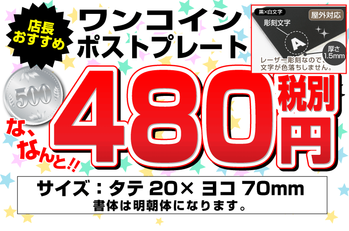 表札 ポスト プレート ワンコイン 480円タイプ 70mm×20mm DM便発送 屋外対応 表札 マンション 戸建 新築 引越 通販 磁石 マグネット テプラ 代用 レーザー彫刻 選べるカラー ステンレス ゴールド 木目 他